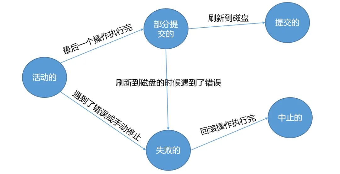 现在我们已经知道,事务其实是一个抽象的概念,由一个有限的数据库操作序列构成,对应着一个或多个数据库操作,这些操作所执行的不同阶段大致上有以下几个状态: