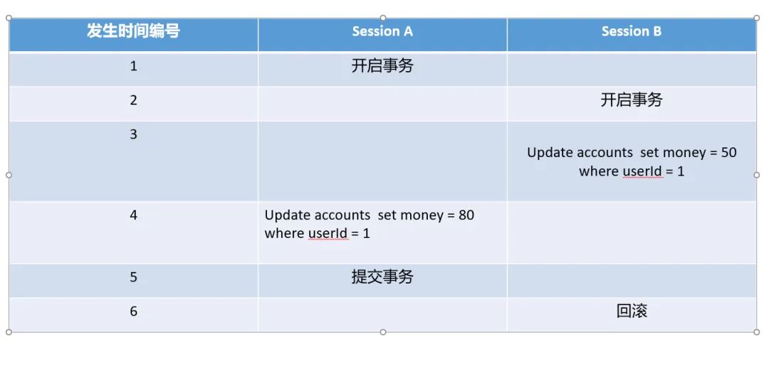 Session A 和 Session B 各开启了一个事务, Session B中的事务先将userId为1改为50,紧接着Session A将userId这行数据改为80,然后提交。Session B在执行过程中遇到了错误或者其他状况执行了回滚,然后将Session A的更新也不复存在了。这种现象我们一般称之为脏写,这是一种十分严重的现象。