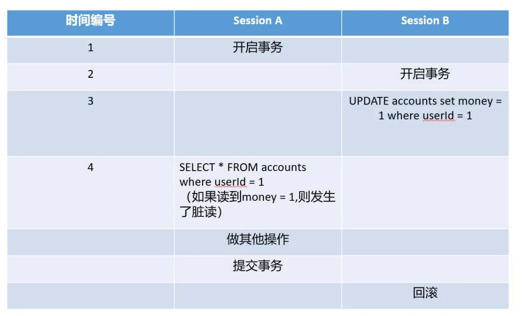 如上图所示,Session A 和 Session B各开启了一个事务,Session B的事务先将userId为1的那一行的money列改为1,Session A查询到了Session B 还未提交的记录,然后 Session B执行了回滚,那么Session A就好像读到了一个不存在的数据一样,这种现象我们就称之为脏读。
