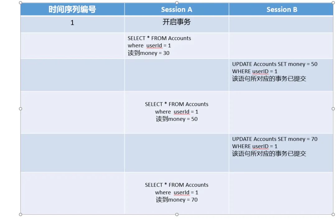 Session B中的修改语句属于隐式事务, 隐式事务意味着语句结束之后,事务就自动提交了,这些事务都修改了userId为1的记录列money的值。每次事务提交之后,如果Session A中都能从查询到最新的值,这种现象就意味着发生了不可重复读。