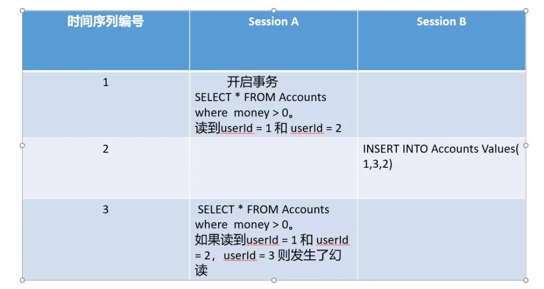 Session A 先根据条件money 大于0查到了一些记录,Session B中插入了符合条件的记录被Session A 中的事务再根据条件查询时查到了Session B中插入的记录,这种现象我们称之为幻读。如果我们在Session B中删掉了 userId ,Session A再根据条件查询时发现变少了,那么这种情况算幻读吗?不算,幻读强调的是一个事务按照某个相同条件多次读取记录时,读到了之前没有读到的记录。对于之前读到的记录,之后读取不到,这种应该算做不可重复读。