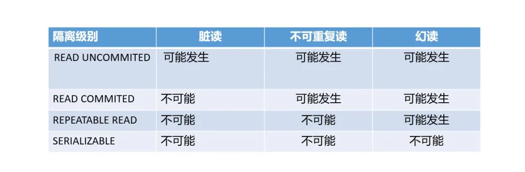READ UNCOMMITED: 未提交读 READ COMMITED: 已提交读 REPEATABLE READ: 可重复读 SERIALIZABLE: 可串行化