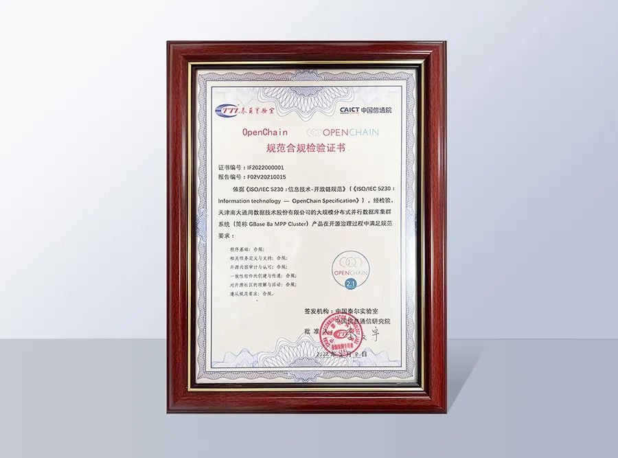 2月17日,中国信通院开源治理合规检验产品发布暨研讨会于中国信通院科研楼多功能厅举办。在会上,南大通用大规模分布式并行数据库集群系统GBase 8a产品通过检验,在开源治理过程中满足规范要求,成为首批通过OpenChain规范的数据库产品,并颁发检验证书。