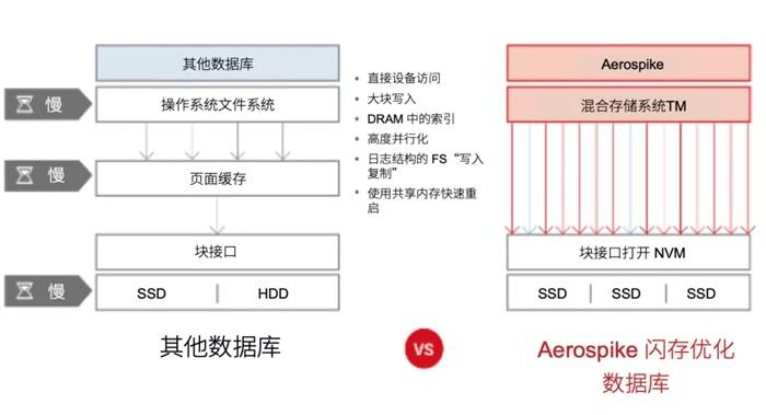 Aerospike还针对SSD进行了优化,绕过操作系统的文件系统,直接将SSD作为块设备读写,避免额外的I/O损耗,降低了延迟。