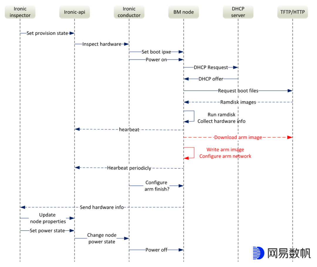 除了给网卡安装系统外,其他的流程与社区的Ironic inspect基本一致。ironic-inspector 发起请求,ironic conductor收到请求后通过IPMI 给裸机节点设置PXE启动并开机,接下来就是DHCP 获取IP并从HTTP Server获取带IPA(Ironic Python Agent)的ramdisk镜像。通过ramdisk image里带的内核参数,从HTTP Server下载指定的网卡镜像,安装完毕后通知Ironic inspect结束整个流程。