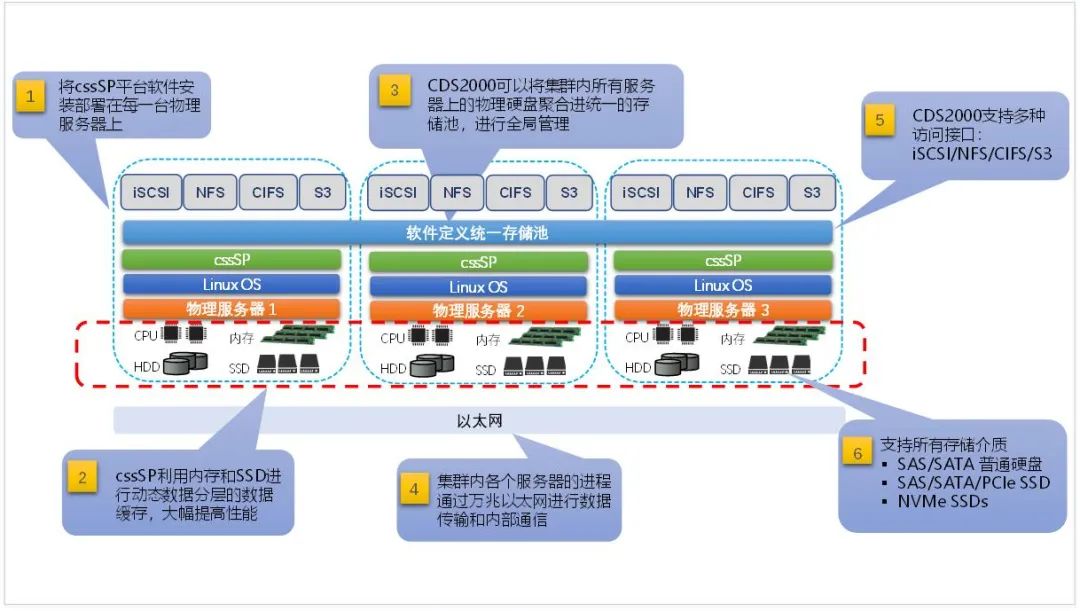 CDS2000超融合分布式存储系统,基于分布式架构,采用软件定义、数据存储分层等技术,是自主研发的具有互联网基因的企业级产品。本产品集存储服务,大数据分析,数据保护,混合云集成于一体,适配X86服务器,支持PK体系。