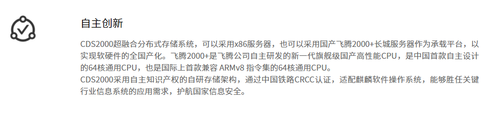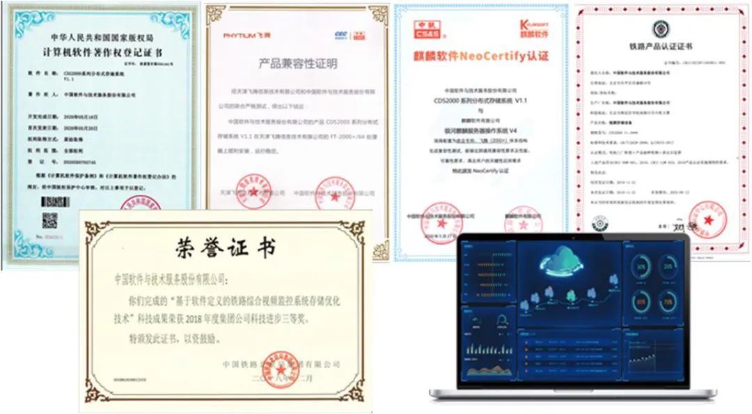 CDS2000超融合分布式系统具备计算机软件著作权,取得了飞腾CPU、麒麟操作系统的兼容性认证。目前CDS2000超融合分布式存储系统,已在全国30个高铁站投入使用,总容量超过100PB。