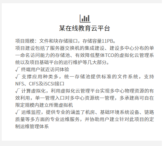 CDS2000超融合分布式存储系统凭借其高性能,高可用,大规模横向扩展,全时在线,无间断平滑升级能力,可适用于视频监控、海量存储、大数据分析、数据保护等场景。在铁路、金融、媒体、医疗、能源、科研等各种行业广泛使用。帮助用户整合多方数据、简化运维管理、提高存储效率、降低总体拥有成本(TCO),是一款先进的Cloud-Ready的下一代一站式交付的平台级解决方案。