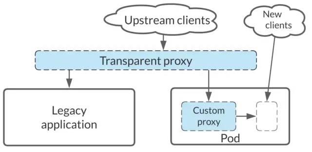 相对于将自定义代理逻辑放到共享层里,不如将其作为新服务的一部分。但是,我们不会在编译期将自定义代理嵌入到服务中,而是使用 Kubernetes sidecar 模式,使代理成为一个运行时的绑定活动。借助这种模式,遗留客户端使用协议转换的代理,而新的客户端则会使用新的服务 API。在代理内部,调用会被进行转换,并被转移到新的服务上。这样的话,在需要时,我们可以重用代理。更重要的是,当遗留客户端不再需要代理时,我们可以很容易地将其拆除,而对新服务的影响做到了最小。