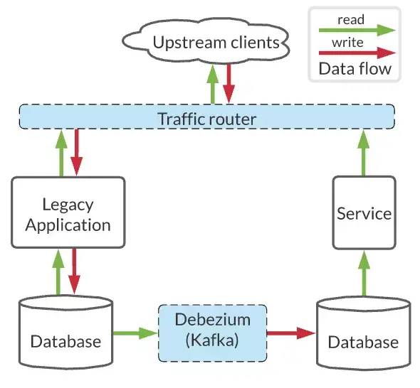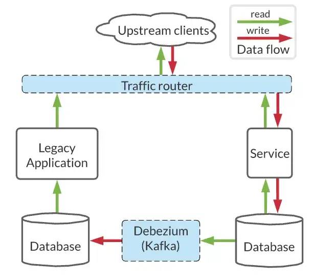 结合对 Debezium 的快速描述,我们看一下在 Strangler 模式下的使用情况。假设,到目前为止,我们已经完成了如下的工作: