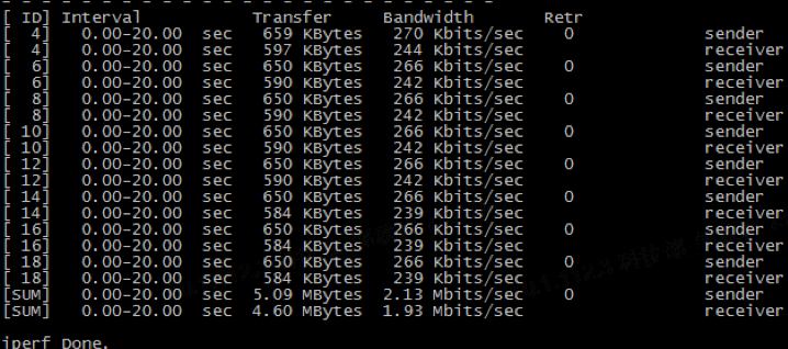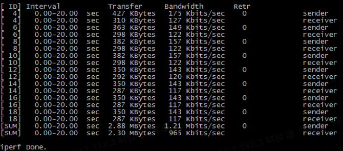 2. 在节点B启动iperf server,在节点A启动iperf client对节点B进行压测,可以看出速度限制在1Mbits/sec以下: