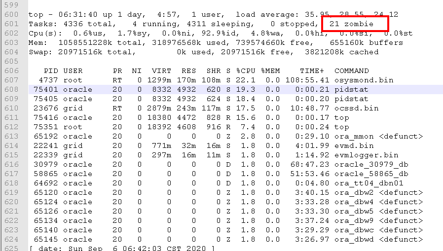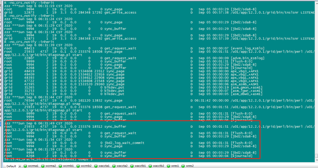 通过分析“D”状态进程种类,用户等信息,不仅仅是Oracle用户进程状态转变为“D”。排除数据库进程本身引发的“D”僵尸进程,并重点检查IO情况。