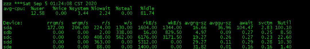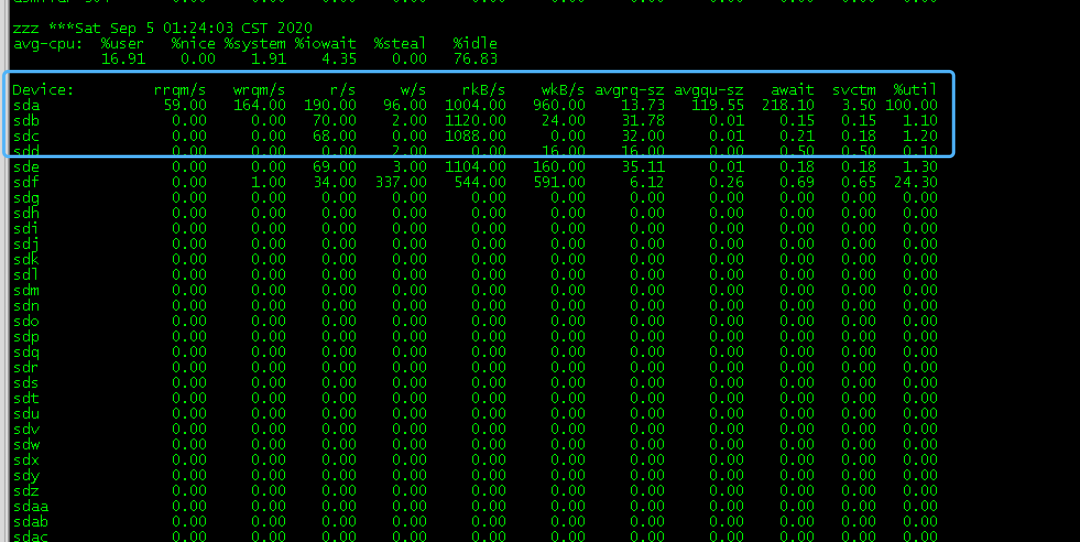经过分析“D”状态进程存在共性,均与/u01(sda、sda8)本地磁盘相关,随即排查本地磁盘的IO性能情况。