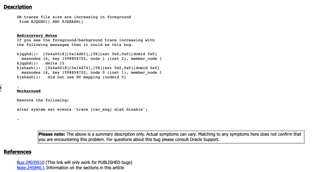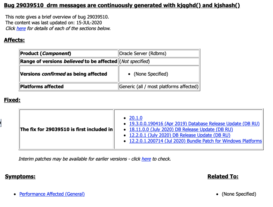通过查阅OracleMOS支持文档、疑似命中Bug29039510 - drm messages are continuously generated with kjqghd() andkjshash() (Doc ID 29039510.8),描述信息如下:
