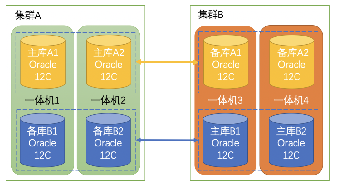 为提升业务系统连续性,基于现有硬件资源,使用两套一体机资源部署两套数据库,互为Oracle主、备库角色,简要架构示例如图: