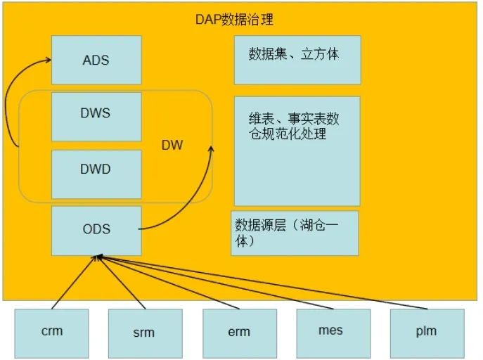 关于DAP中的数据治理过程主要说的就是数据从业务系统到ODS再到数仓最后形成相应的数据集立方体的过程,具体过程如图: