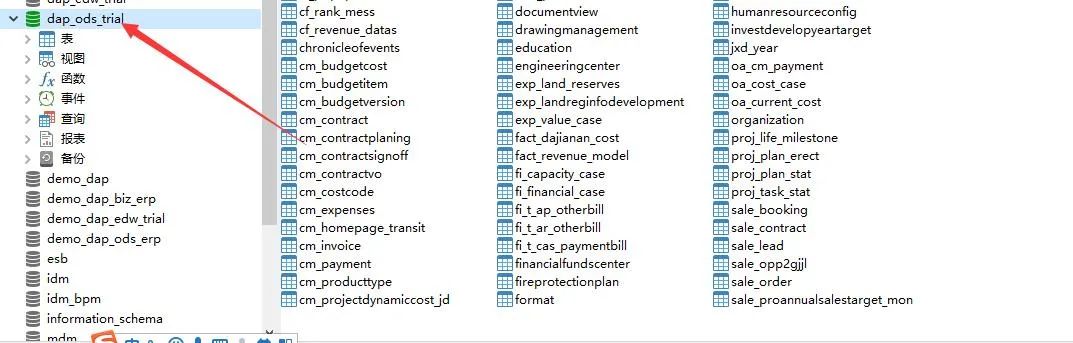至于参考SQL由于其自身的特殊性,我们只需要执行以下SQL,再通过jdbc查询表中的相应数据即可。操作的过程中我们需要注意,源库读取时在原来的库中读取一条数据是不能创建表的也就是要实现我们的治理过程是没用的,实现我们必须要在ODS中创建表,才能结合ESB将数据从ODS运达数仓。下面我们介绍一些进行ODS配置后,到目前阶段应该出现的效果,我们创建完相应的ODS数据点击创建表后,我们在数据库中的ODS库中可以找到相应创建的表,为后续在业务系统中读取数据存入ODS表做准备,具体如图:
