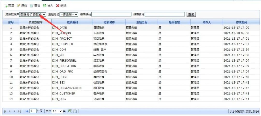 我们可以在具体的ODS库中找到我们刚才创建的数据库,还为接下来选择事实表,维表的创建选择事实表维表的来源表做准备。下面我们对本次数仓改造过程中的新增功能进行下说明,并指出制作过程中的常见问题以及解决办法。首先,首页的上方查询栏的四个条件包含了与数据源头完善相关的数据,因此在这里我们需要处理,因为维表、事实表都存储在数仓中,因此我们调整资源数据库未对应的数仓类型数据库即可,如下: