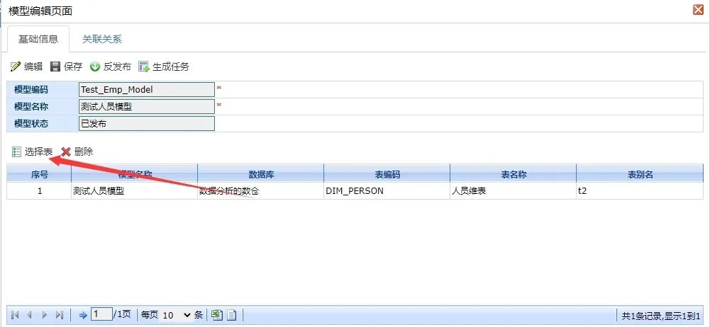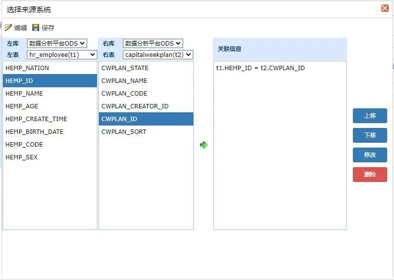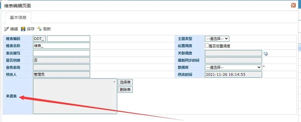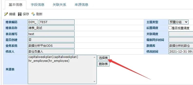 图中就是本次改造的过程中新增的数据,这里维表的来源表就是ODS表因此点击选择表会进入相应的ODS表选择页面,选中相应的ODS表后,便可回写到前端页面上,如下:
