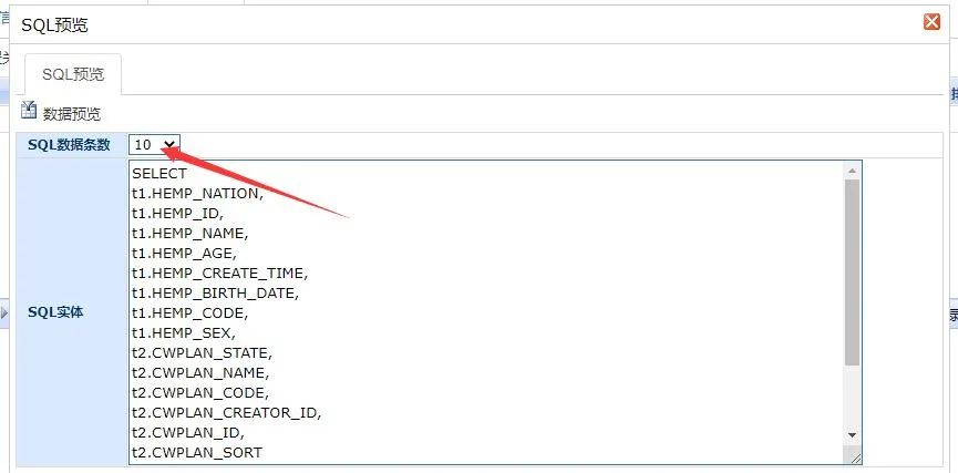 接下来我们可以点击数据预览这样,我们就可以将自己配置的关联关系的两张表,通过关系拼接成一个SQL语句,并且可在该页面内设置相应的SQL语句条数,如下: