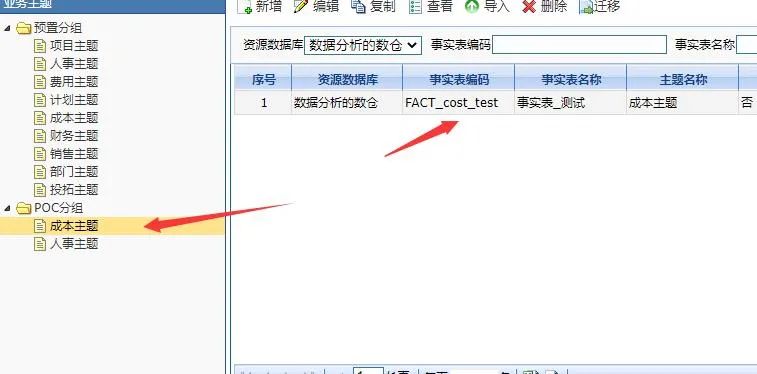 接下来介绍事实表,注意明细页面的事实表编码与维表虽相似,但维表的前缀是死的,而事实表带有主题编码因此是不定长的,这里需要注意页面上的相应设计。而在后台进行的操作基本一致,只是多了查找主题编码这一项操作。然后是上节中我们说到的关系跨库查询,这里我们采取在表的前面添加库名的方式来达到跨库查询如下: