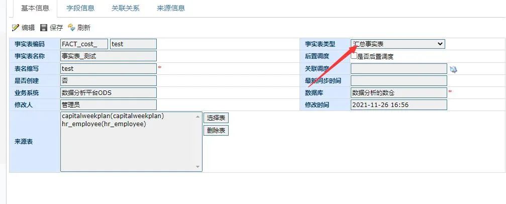 下面来到明细页面,页面中的数据改造与维表相似,但这里来源表的选择规则不同,事实表会根据不同的类型进行选择相应的来源表,首先作为汇总事实表可选择的来源表包含基础事实表、维表、ODS,而基础事实表只能选择维表、ODS,因此我们需要根据不同的类型切换展示表中的数据,如下: