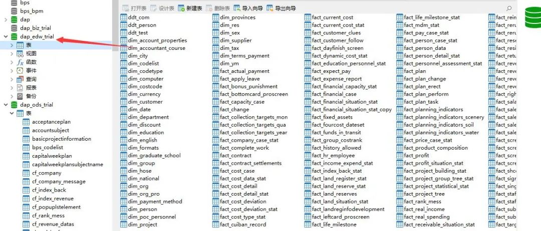之后就是我们在选择表的时候如何控制,表中的类型,这里还算相对比较简单,我们的明细页面中本身就存在类型属性,只需要将他作为参数闯入相应的弹窗页面即可。但这里涉及到一个问题,如果为空便不能正常显示数据,这里解决办法有很多,例如去除下拉框中的空值,或在对应的弹窗中进行校验提示等......最后就是我们在上节中说到的因为维表设计的类型较多,再取字段的时候需要涉及的操作较多,不妨我们并在一起,一个id三查询同查非空的便是我们要寻中的表类型。上述是研发过程中的问题,接下来介绍使用过程的注意事项。首先确保ODS库中你创建的数据要与DAP中ODS表中录取的数据编码一致,否则这里面涉及到SQL相关的问题将会出现错误,接下来我们需要注意我们要在模型中对自己创建的维表事实表进行相应的关联操作,才能在后续的治理过程中起到相应的效果。在进行完数仓配置后,我们建立的维表、事实表均可以在对应的数仓数据库中找到,用来完成最后ODS到数仓的过程,具体位置如下: