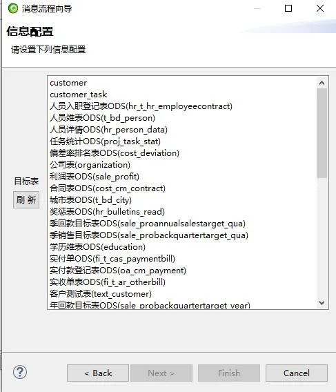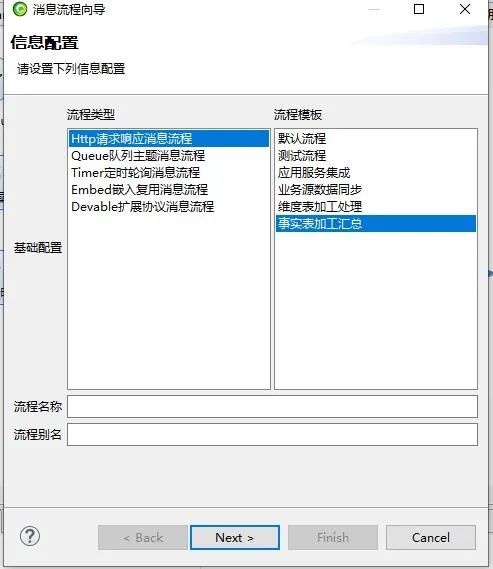 接下来我们来介绍事实表的流程创建,在ESB设计器中新建调度流程,选择http请求响应消息流程,之后选择事实表加工汇总,点击next,点击刷新就会出现ODS到事实表的调度流程。