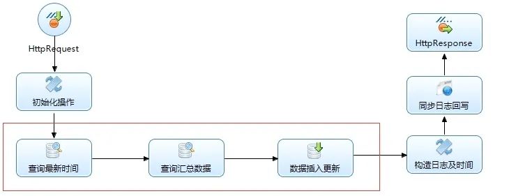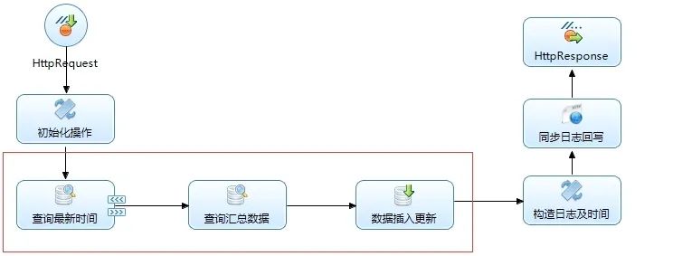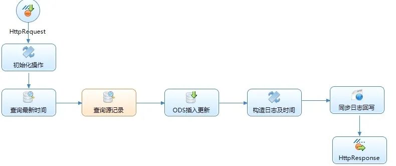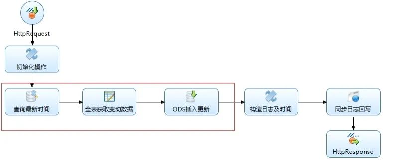 选择对应流程后就会生成相对应的数据调度流程,接下来我们需要找到我们需要修改的节点,一个同步时间、一个读取、一个插入三个节点我们需要进行手动操作,如下: