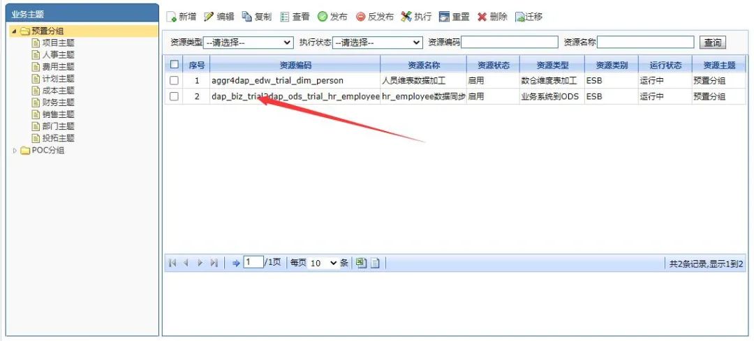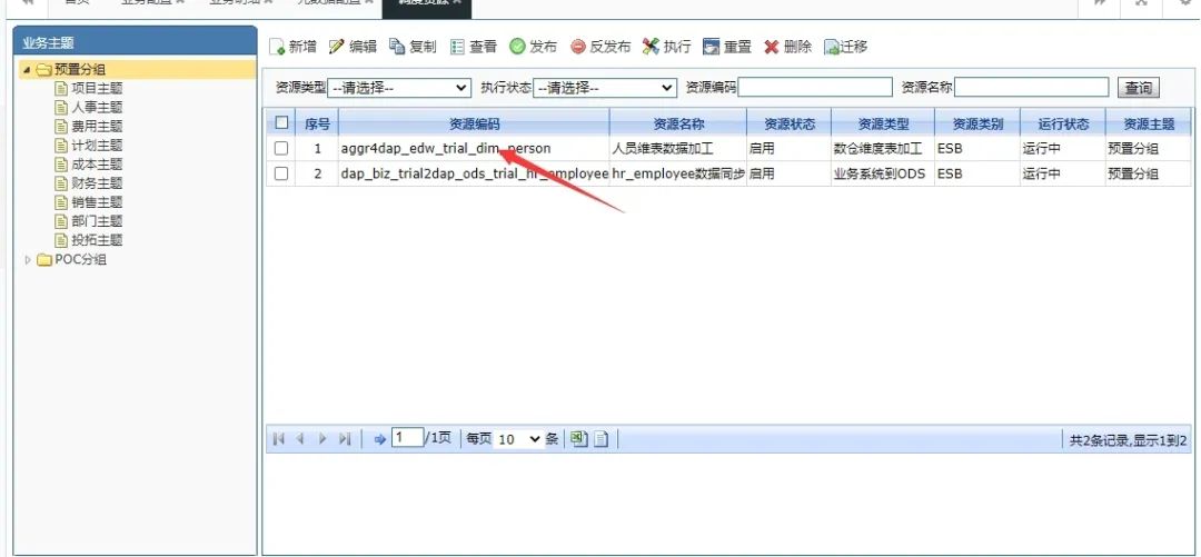 这里我们需要在查询源数据记录节点配置对应的SQL语句,其他的操作与对比字段模式相同,就不再重复说明了。以上是两种不同ODS调度的调度流程以及相关配置。流程创建结束后我们可以看到在DAP的调度资源界面可以看到创建的流程信息,如下: