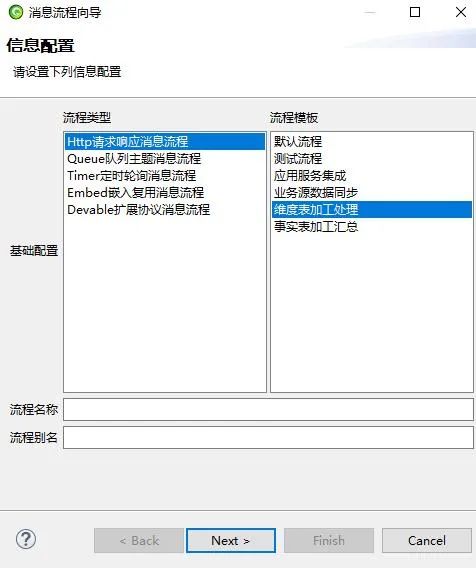 下面我们介绍维表的流程创建,在ESB设计器中新建调度流程,选择http请求响应消息流程,之后选择维度表加工处理,点击next,点击刷新就会出现业务系统到ODS的调度流程。具体如下: