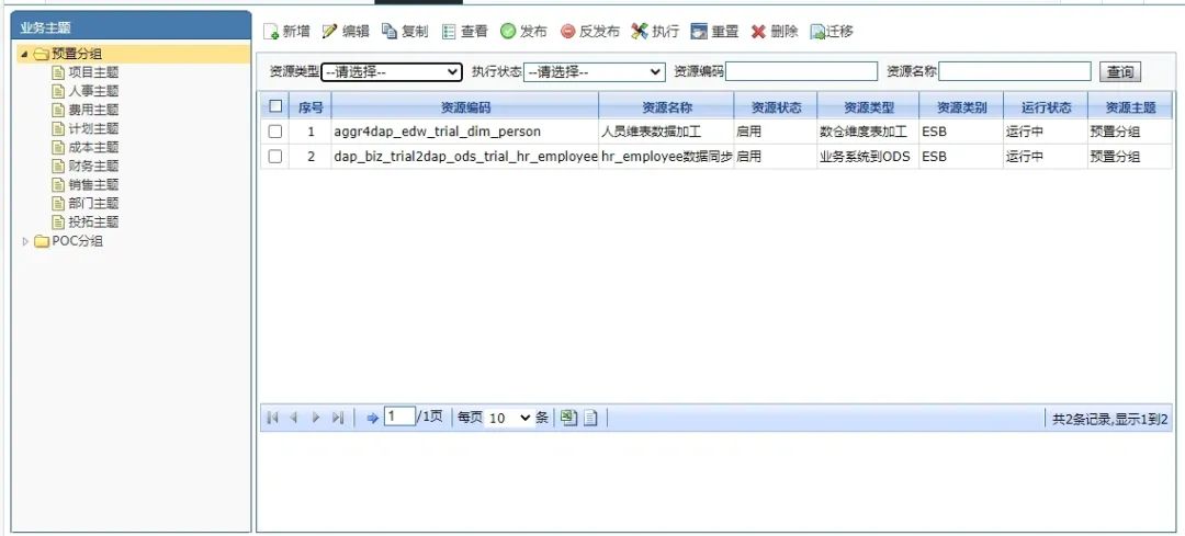 这里我们需要修改上面上个节点,同样的道理时间节点需要调整数据源、查询汇总数据节点需要调整数据源,调整对应的SQL、调整映射、数据插入节点需要配置唯一字段和映射。流程创建结束后我们可以看到在DAP的调度资源界面可以看到创建的流程信息,如下:
