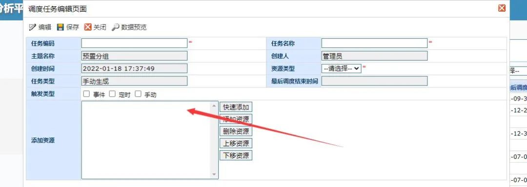 接下来我们就可以通过上文介绍的创建流程的方式进行流程的创建,创建后我们可以通过调度任务中的快速添加通过模型加入资源,如下: