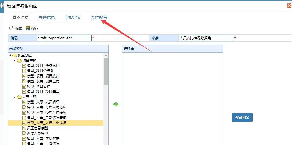 添加的方式通常为快速添加和添加资源,这里快速添加时通过模型关联的调度直接添加相应的资源,不过需要在模型功能下生成任务后的模型才能进行快速添加,而添加资源就是手动的在调度资源中添加对应的资源。添加结束后,如上我们还支持设置任务的触发类型,配置结束后就能看到生成的调度任务。在这一步前我们需要在DAP中创建相应的调度资源和调度任务,因为在此之前整个业务系统到ODS到数仓的过程就都结束了,而要实现这一过程需要相应的调度,接下来我们开始对分析模型模块的改造进行介绍。首先,我们进入数据集或立方体的新增页面我们可以看到其明细页面多添加了一个条件配置标签,具体的样式如下: