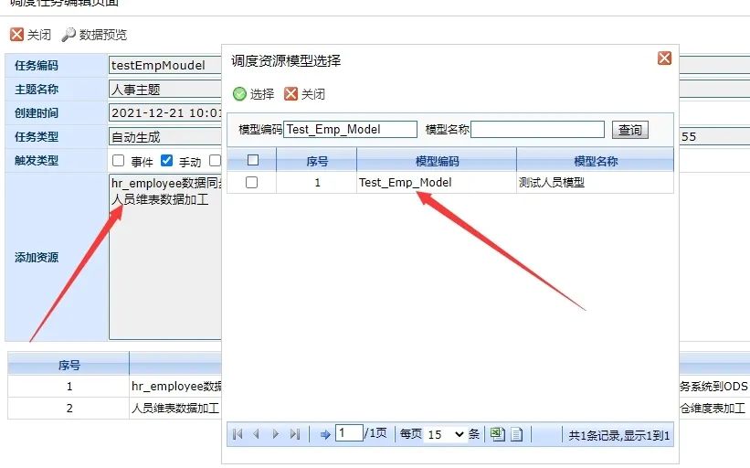 接下来我们在模型中将上面的过程配置到一个模型上,方便我们在调度任务中快速的通过模型拉取相应已创建的调度资源,如下: