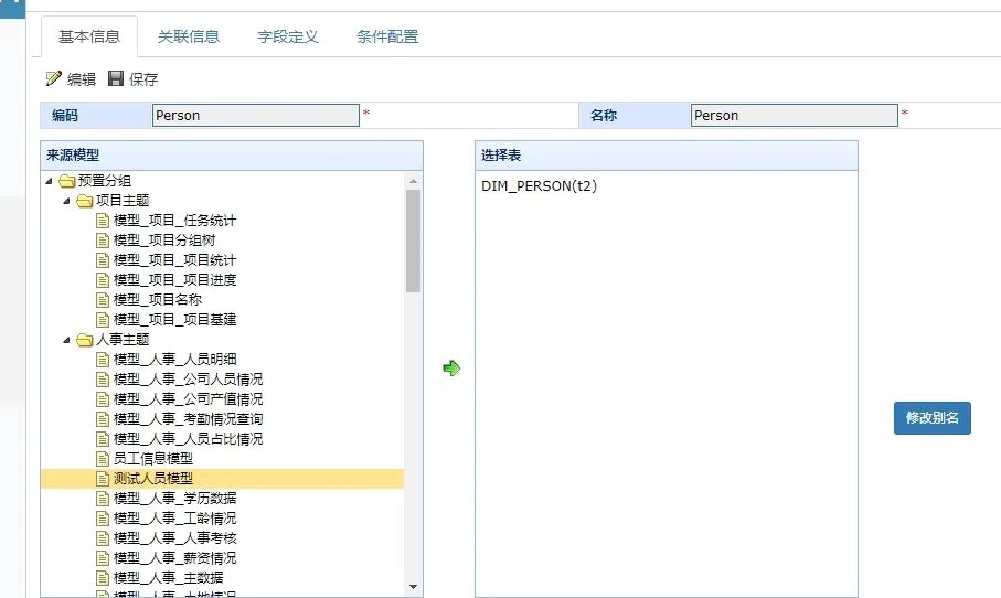 除此之外与维表的改造操作类似,下面是关联关系,这里我们选择三种不同的表,因此这里需要设计到跨库的查询,这里事实表、维表、ODS前两者同后者的数据库定不会相同。初次特殊外其余与上文中维表的操作几乎一致,这里就不再过多赘述了,接下来时字段的改造,这里主要设计如何在代码中区分三种不同的表,这里我们可以根据选择不同的表id带入三种表相关的查询中,然后判断哪个不为空,那么该id就是哪表类型下的表id,方便我们对在三种不同的表中进行相应的的字段查找。以上便是事实表改造的相应功能,下面我们对该过程中的注意事项进行相应的说明。首先,我们明细页面中维表名称的命名规范限制,这里我们采用两个inpu标签,一个可编辑一个不可编辑,不可编辑的标签便是维表命名中所需要的前缀,我们可以在可编辑的标签内输入相应的名字,最终数据会以“DIM_”为前缀进行存储。这里我们需要注意的就是该操作下需要去改变的位置,读取数据和保存数据的方法,其余在数据库中直接读取数据的方法均可不变。调整位置如下: