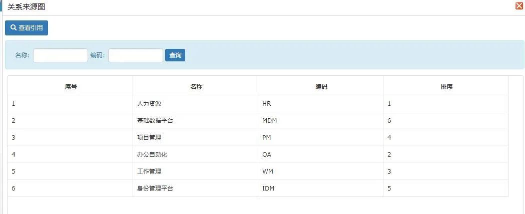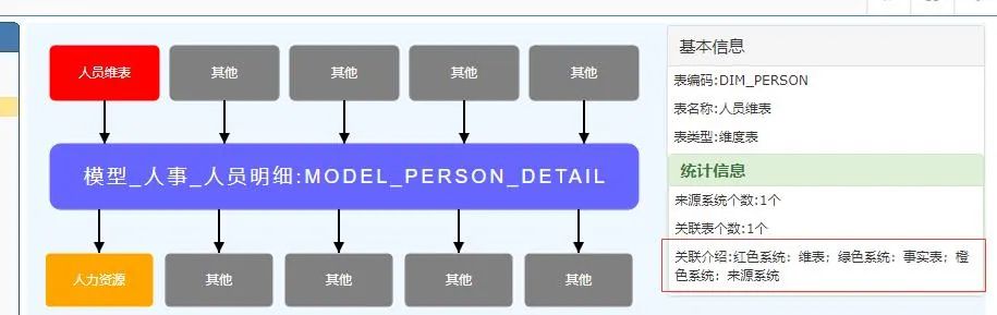 接下来选择你要了解的关系双击下方的表格,进入引用关系图,即从应用系统出发都引用了什么,或是维表、事实表出发,都引用了哪些,如下: