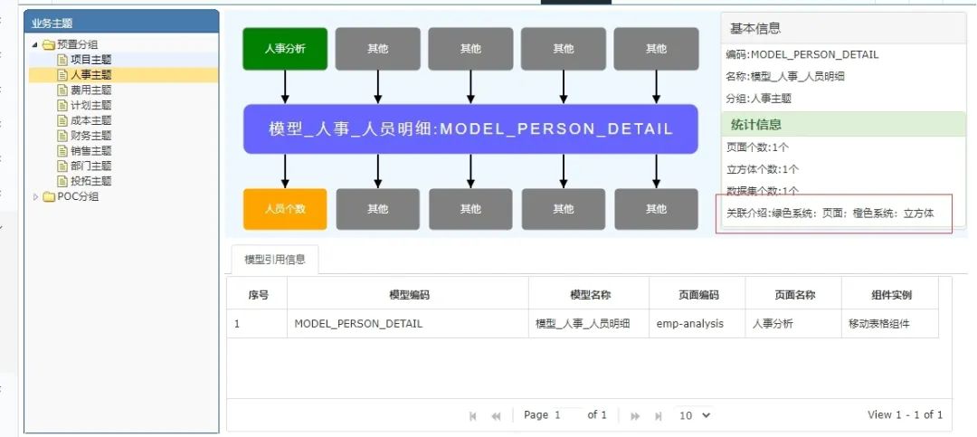 接下来选择你要了解的关系双击下方的表格,进入来源关系图,即从页面出发,都哪些组件引用了该页面,会从立方体出发都哪些组件引用了该页面,如下: