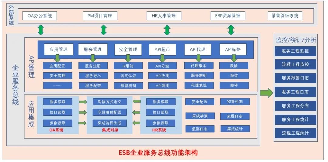 本文主要对ESB企业服务总线其中之一的设计器进行说明,主要涵盖各个组件的使用,分类包括数据的映射转换、数据适配器、协议适配器以及文件传输相关的组件等等,具体内容如下。在对各个组件进行介绍之前首先对ESB企业服务总线进行整体的介绍,包括产品的组成部分以及产品的相关核心功能,其次对ESB中常用的数据格式,包括DataRow、DataSet、DataBag以及DataBox进行说明,最后对各个组件进行功能大体说明。注意:由于映射转换组件数据格式过多,本篇文档不对映射、路径、转换等组件进行介绍,后续会有专门的文档对ESB映射转换部分进行介绍。ESB企业服务总线主要包含三部分,ESB设计器、SMC管理控制台以及Server运行环境,ESB设计器用于服务以及集成流程的开发,可以直接将服务或者流程部署在Server当中,并通过前端管理控制台SMC来对服务以及流程进行管理,并进行监控统计分析。同时ESB企业服务总线也可以和其它产品相互组合,形成不同的解决方案,如主数据治理方案、统一身份认证方案、数据治理分析方案等等,ESB整体功能架构如下: