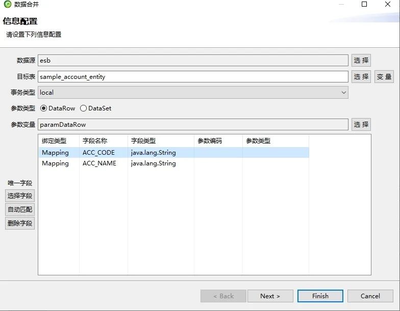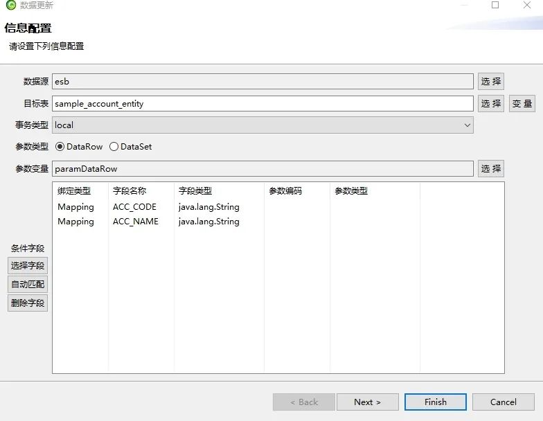 e)选择字段:从数据库中选择需要变更的字段,点击Next后会更新是需要更新的字段信息,如果选择字段和来源变量中的字段相同则执行更新操作。