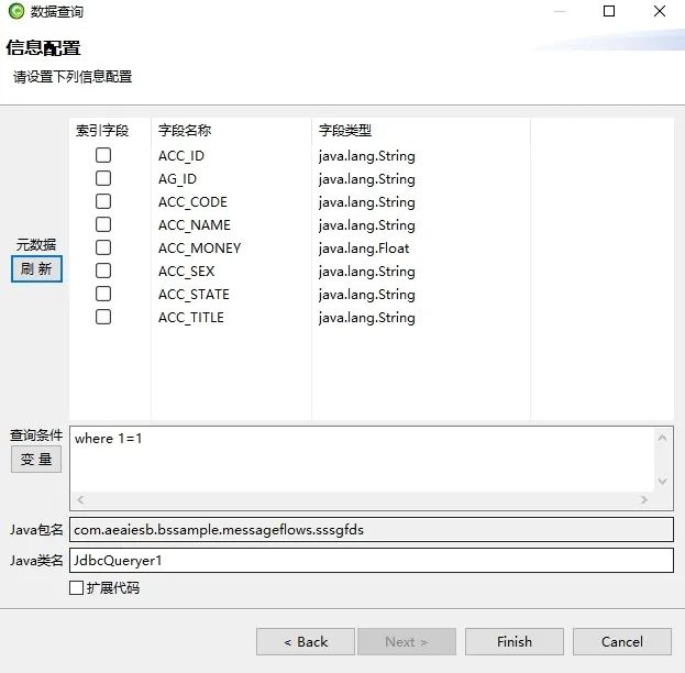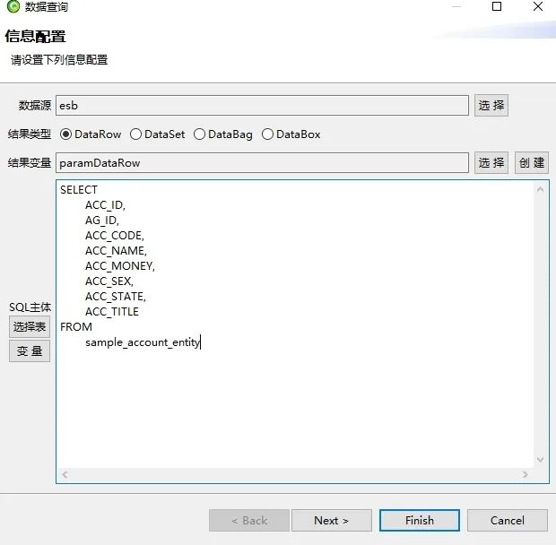1.数据源:需要查询数据的数据库,在SMC管理控制台注册的;2.结果变量:可以以DataRow、DataSet、DataBox、DataBag等数据格式接收数据;3.SQL主体:单表可以选择数据表自动生成SQL,也可以按照人工手写SQL;4.Next下一步点击刷新按钮可以生成对应的元数据信息。