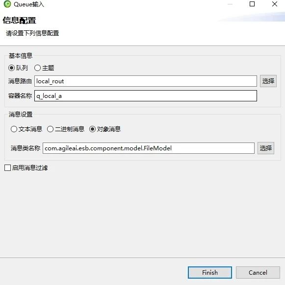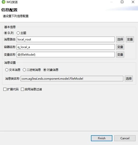 MQ的消息发送可以选择主题和队列的形式,组件配置详细参数如下:a)消息路由及容器名称:可以在前端管理控制台中直接选择配置完成的消息队列资源;b)变量名称:需要推送到消息队列中的消息体或者数据信息,在录入完成后会在消息设置中自动回填。2.MQ调用:MQ调用会监听消息队列以及主题当中的数据信息,并将该数据格式转存到流程变量当中;