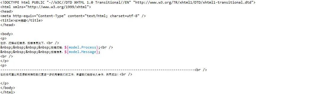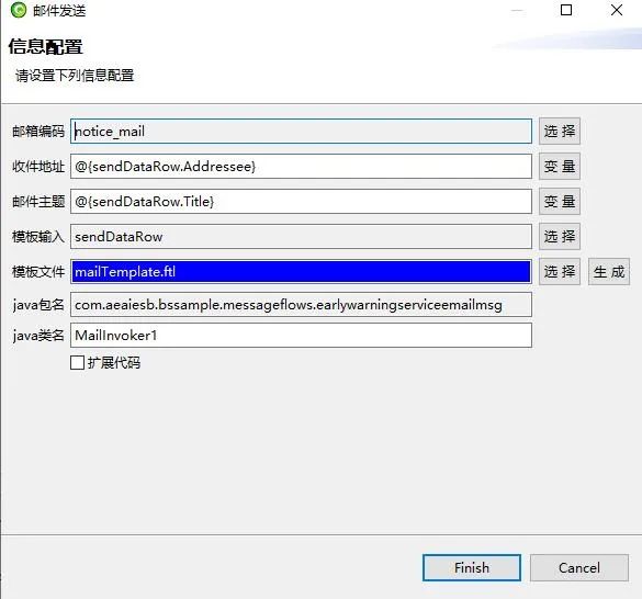 1.邮箱编码:引用在SMC资源配置的Mail资源;5.模板文件:点击生成按钮可以创建对应的模板文件,在模板内部可以引入变量信息,可以通过${model.Message}的形式引入。