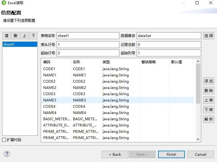 c)文件模板:选择Excel文件后生成对应的文件模板;d)字段映射:生成DataSet存储Excel表格中的数据。
