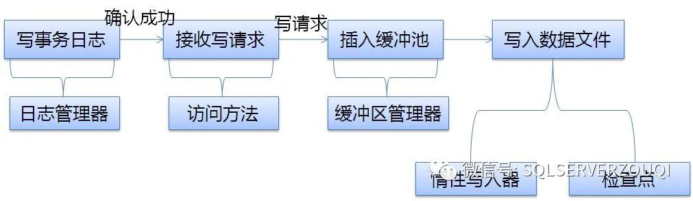 插入缓冲池:缓冲区管理器在内存中插入数据,插入成功后将确认结果发送给访问方法,最终确认结果到达客户端。
