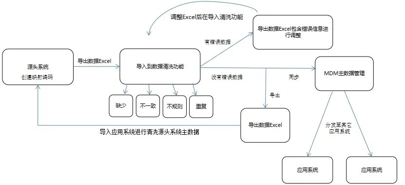 通过以上各个过程的相互配合去从根本上解决企业各个业务系统之间数据不能共享,数据重复、错误等问题。使企业在数据方面更完善,业务进行更顺畅。通过数据清洗功能下载主数据导入模板,源头业务系统把数据填写模板中,通过数据清洗导入功能进行导入清洗,检测出数据中欠缺的、重复的、不符合规则数据,通过导出功能把失败的数据导出到Excel中进行数据处理后,在重新导入重新检测直到所有数据成功为止,然后把所有成功的数据导出Excel中,返回给业务源头系统进行源头系统的数据清洗(源头系统添加主数据编码映射),通过主数据任务分发把标准的数据分发给业务,这样就把源头、主数据、下发至业务系统数据保持一致。