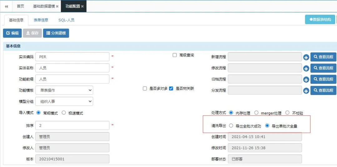 接下来是功能建模,功能建模中配置的一个是数据清洗导出的策略,这个导出包括过程中导出和导出最终清洗结果。这个策略分为两种,分别为导出全批次成功和导出单批次全量。全批次成功导出的是所有批次下清洗成功的数据,单批次全量导出的是最后一个批次下的所有数据,如图所示: