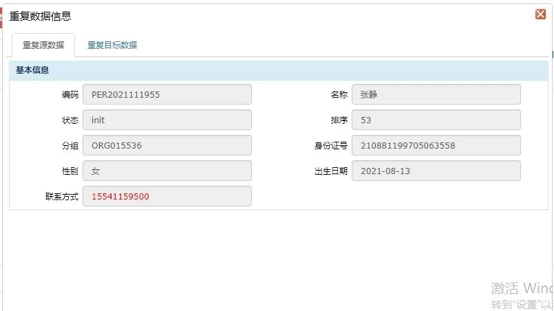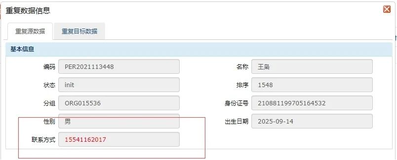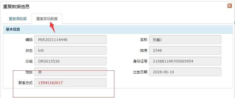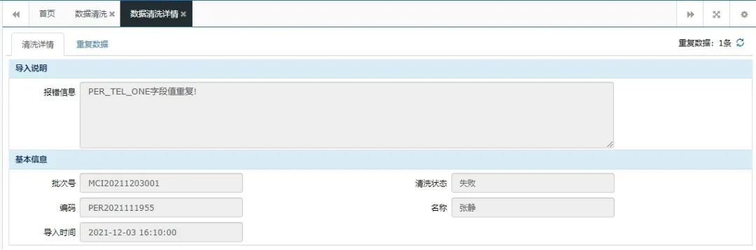 进入到数据详情页面可以查看重复数据的信息,包括常规的字段和重复的字段信息。