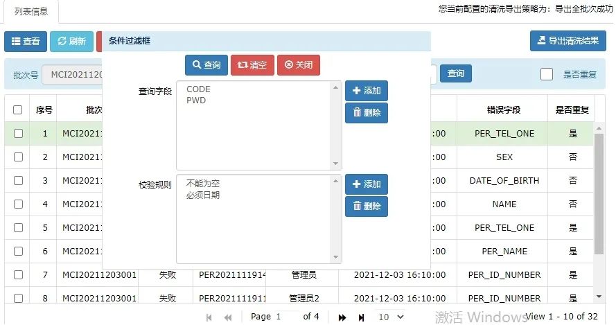 完成以上这些配置后就可以进行数据清洗功能的相关操作了。2.完成数据清洗相关配置的功能,如:是否清洗,导出策略;3.完成清洗数据的导入功能,又可细分为三部分:常规数据的导入,错误数据的导入和重复数据的导入;5.完成清洗数据重复数据的查看和其它操作功能,如:排除重复数据和还原重复数据;6.完成数据的过滤筛选功能,如:批次号过滤,错误字段过滤和校验规则过滤等;7.完成清洗数据的导出功能,如:批次导出和导出最终结果。在将数据导入到清洗功能中后可以对错误数据进行查看,有详细的错误信息可以查看,另外也可以查看重复数据,排除重复数据。除此之外还有过滤功能,可以通过字段和校验规则,过滤出相关的数据,下面的内容中将会对这些功能进行详细介绍。点击查看数据,或者双击可以查看错误数据信息或者是重复信息。