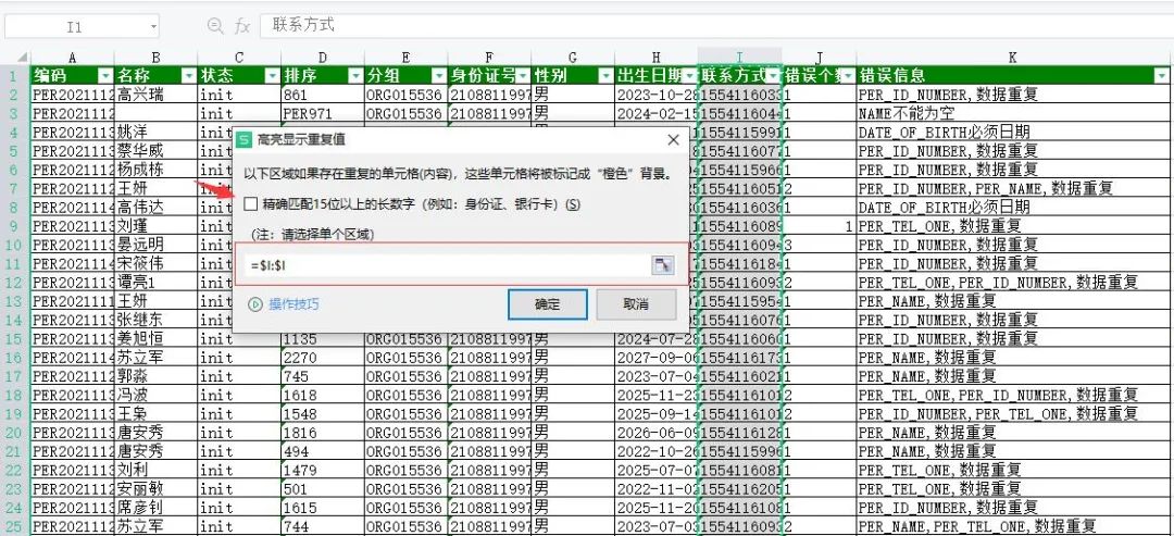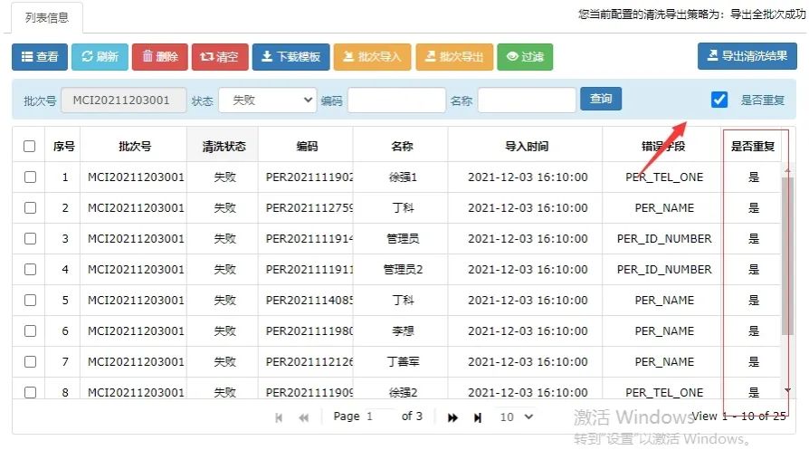 重复数据的导入需要在错误信息全部导入完成之后,将没有错误的数据整理到一起,再对这些数据进行循环读取,通过巡检规则来判断配置的字段是否存在值相同的情况,如果存在,修改清洗状态为失败,获取到重复的字段,然后将数据导入到重复数据表中。